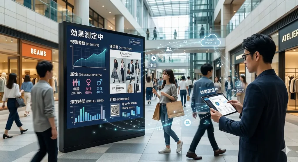 視認数や視認時間といった基本指標を継続的に測定し、POSデータや外部環境データと連携させることで、投資対効果を明確にすることが可能です。
